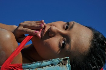 Brunette hottie adores exploring the most isolated places where she can enjoy her naked body, take twisted positions and caress her curves with red band