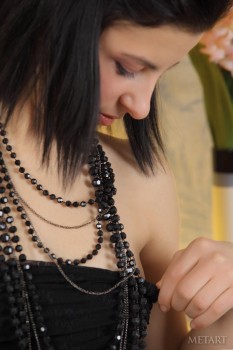 Glam brunette takes off little black dress to boast about the beauty of her hot smoking body and to caress it with long black beads on chair