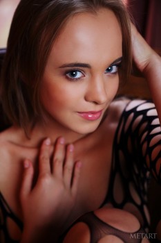 Slim cutie in catsuit with holes lifts long legs into the air to open pussy and give a close-up view of her clean shaved slit on camera.