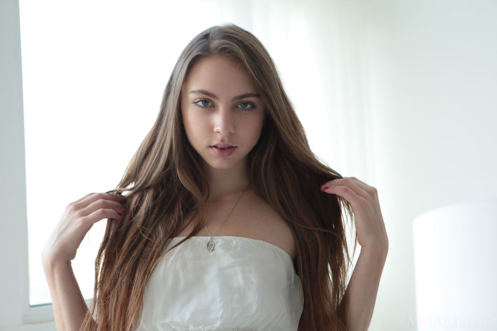 Sweet-looking brunette comes back home, gets rid of her high-heeled shoes and tight dress to go for a walk, as well as to show off her naked body