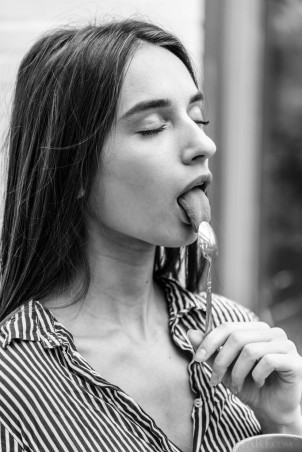 Totally naked brunette comes up to a wide window to enjoy her morning cup of coffee, to play with her curvy body and to enjoy a beautiful view